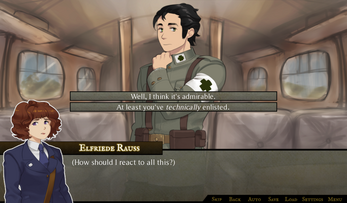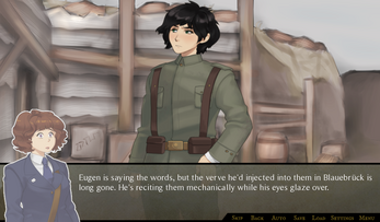 The writing is where this game shines. Varied characters with different reasons for signing up for the war (or not doing so, as the case may be), not all of them necessarily likeable. I notably like Elfriede, our protagonist, a lot. She actually has a better idea about how the whole thing will turn out than most of the people in her home town, but assumes that she must be overthinking things when almost everyone else is so excited for the war. She has her funny quips (mostly in her internal monologues) early on, but doesn't force them into the later, more sombre scenes, where they would feel out of place. I do hope that her sense of humour comes back in future acts, though, to alleviate some of the heavy mood once she gets more used to the general atmosphere in the trenches.